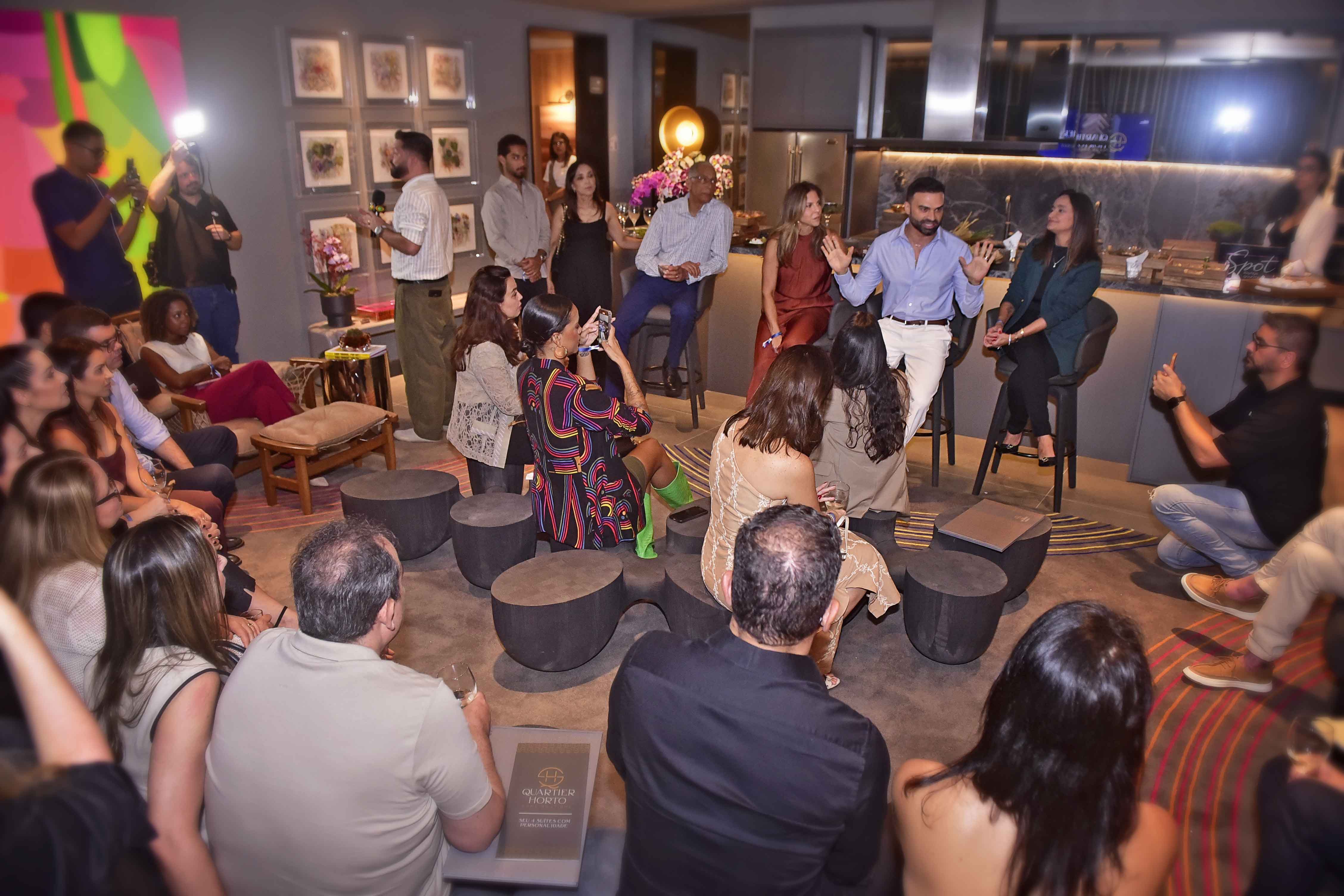 Na quarta-feira (5), o arquiteto Flávio Moura abriu a programação com um encontro que uniu arte, curadoria e bem-viver. A convidada especial da noite foi Eva Peña Cal, curadora e especialista em arte contemporânea, que conduziu um talk sobre o olhar curatorial e a presença da arte na vida cotidiana, dialogando com a estética e o propósito do Quartier Horto.