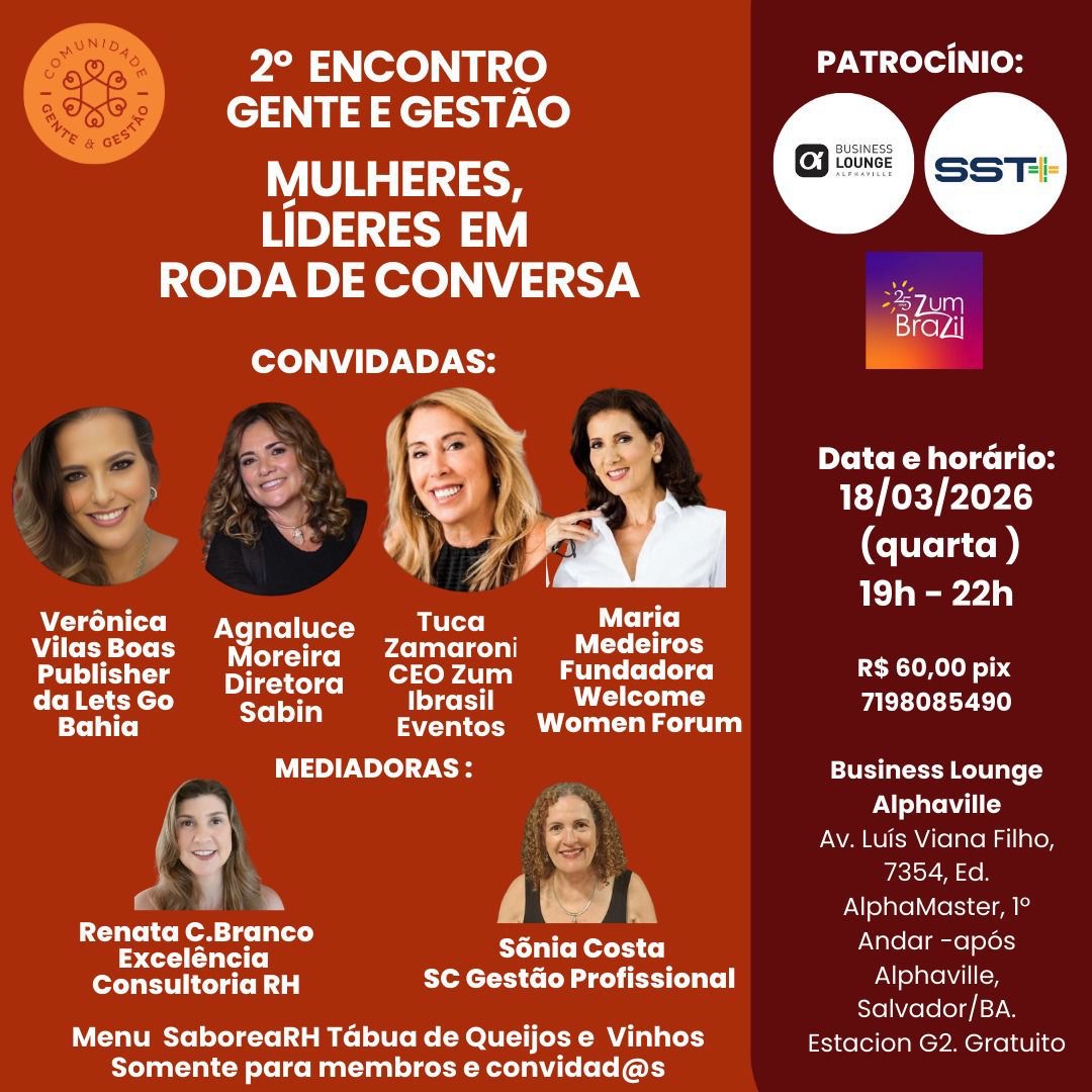 Salvador recebe, no próximo dia 18 de março, a segunda edição do Encontro Gente e Gestão Bahia, que nesta edição traz como tema central “Mulheres, líderes em roda de conversa”.