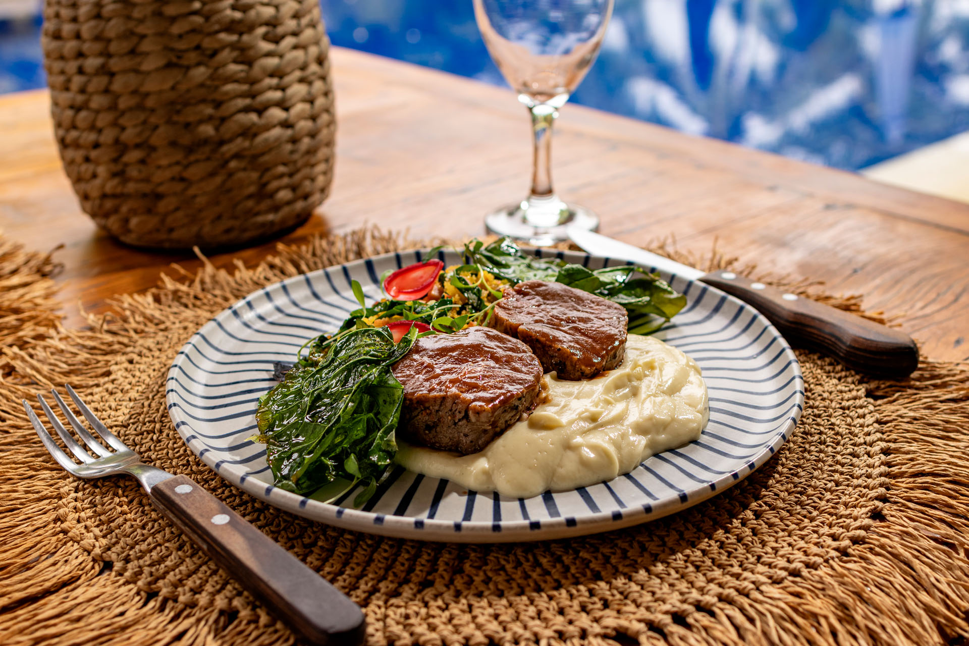 Refúgio da Vila Boutique Hotel & Spa | Filé do sol com mousseline de aipim, tropeiro de cuscuz, cebola bruleé e crispy de couve folha | Chef Reginaldo Machado