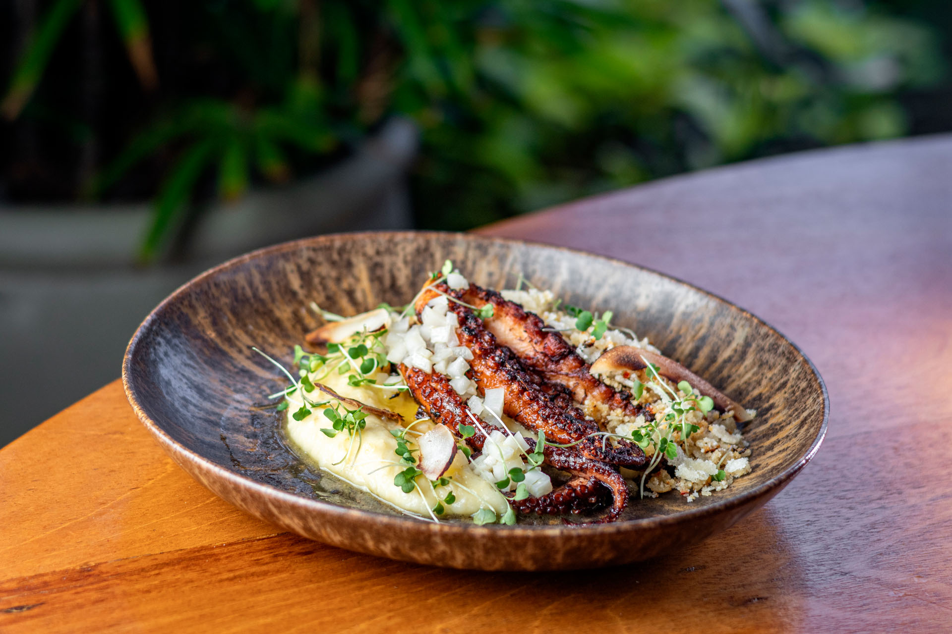 Tivoli Ecoresort Praia do Forte - Restaurante Tabaréu | Da Roça ao Mar - Polvo grelhado na manteiga de garrafa. Acompanha aligot de aipim com queijo de cabra e leite de coco, farofa de tapioca com mel, pimenta e vinagrete de coco com cachaça | Chef Tânia Godoi (DF/BA)