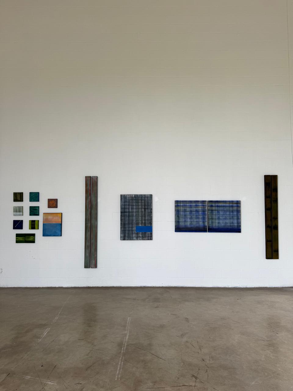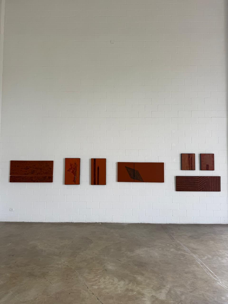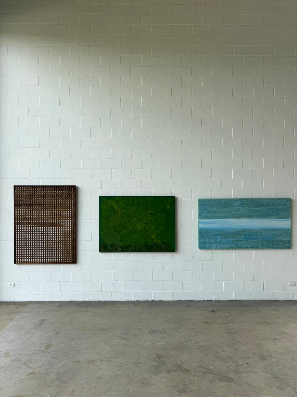Na nova exposição, essa relação com a natureza se amplia. Obras como “Mangue” exploram tonalidades verdes densas que remetem a ecossistemas vivos, enquanto séries como “Vergalhões”, “Vigas de Sustentação”, “Ferrugem” e “Canos” incorporam óxidos e minerais que sugerem estrutura, desgaste e passagem do tempo. Há também trabalhos inspirados na Amazônia, que tensionam beleza e alerta ambiental.